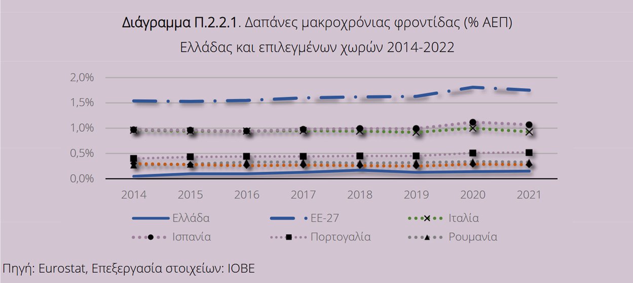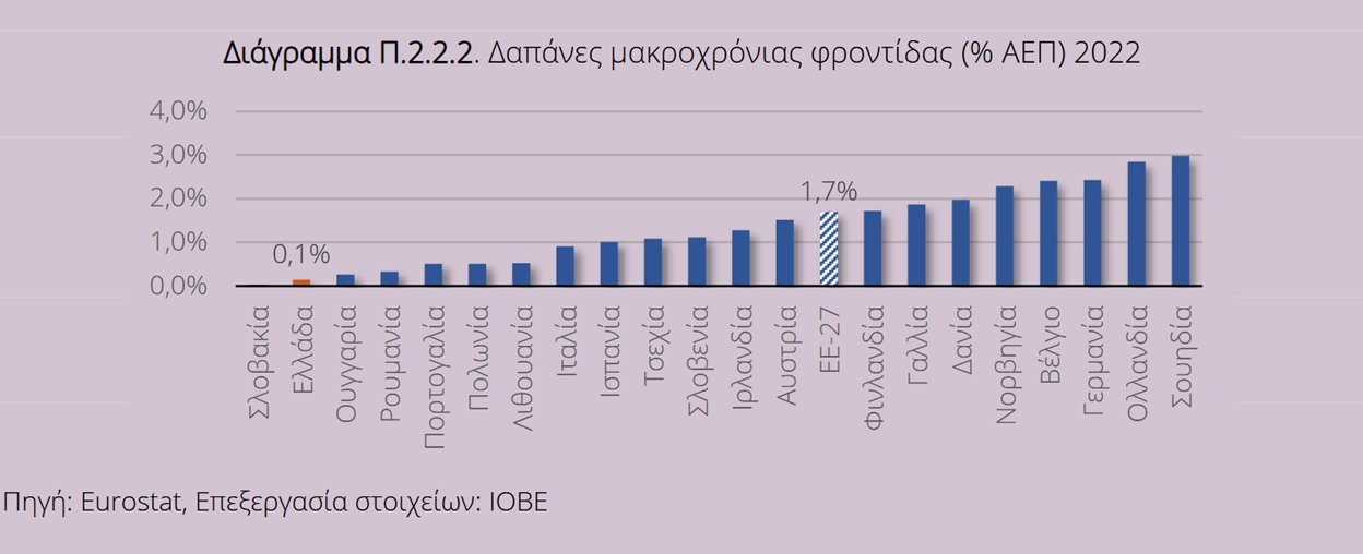 Σύμφωνα με ειδικό πλαίσιο στην έκθεση για την ελληνική οικονομία του ΙΟΒΕ στο οποίο αναλύονται τα πιο πρόσφατα διαθέσιμα δεδομένα (2022), οι δημόσιες δαπάνες για μακροχρόνια φροντίδα στην Ελλάδα το 2022 αντιστοιχούσαν μόλις στο 0,1% του ΑΕΠ, κατατάσσοντας τη χώρα μας στη δεύτερη χαμηλότερη θέση μεταξύ των κρατών-μελών της Ευρωπαϊκής Ένωσης ενώ ο ευρωπαϊκός μέσος όρος διαμορφώθηκε στο 1,7%.