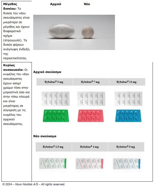Τα νέα δισκία Rybelsus θα είναι μικρότερα και θα έχουν διαφορετικό (στρογγυλό) σχήμα. Το εξωτερικό κουτί και η κυψέλη (blister) θα είναι μικρότερα, ενώ οι ταινίες της κυψέλης θα είναι ασημί και στις δύο πλευρές (βλ. εικόνες παρακάτω).