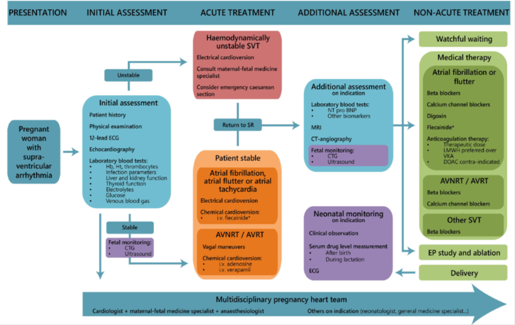Στο Ramlakhan KP, et al. Heart 2022;0:1–8. δημοσιεύτηκε ανασκόπηση για τις υπερκοιλιακές αρρυθμίες στην εγκυμοσύνη(με ελεύθερη πρόσβαση). Η Κολπική μαρμαρυγή είναι ασυνήθης(31-59/ 100 000 κυήσεις). Η φλεκαινίδη αποτελεί σχετική αντένδειξη σε δομικές καρδιοπάθειες και στον κολπικό πτερυγισμό με αγωγή 1:1