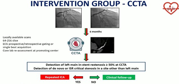 fail to find a benefit from regular checks after PCI, 6 μήνες  this time in a higher-risk population. Routine CCTA after LM PCI did not reduce the composite primary endpoint, but was associated with fewer spontaneous MIs and more imaging-triggered revascularizations.