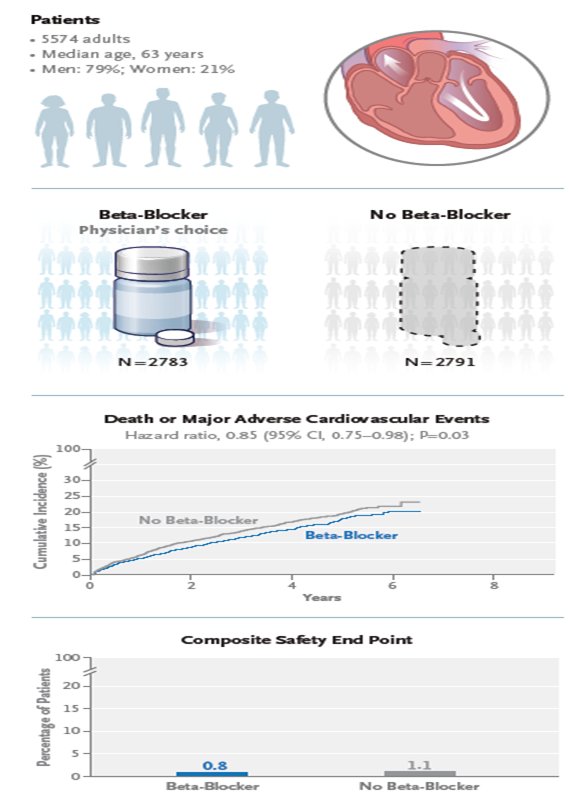 the US guidelines for the treatment of chronic coronary syndromes, long-term use of beta-blockers is no longer recommended for patients without MI in the past year, without impaired LVEF, or without another primary indication for beta-blocker therapy, such as angina, arrhythmias, or hypertension. In patients who’ve had an MI in the past year, physicians are advised to reassess the indication for long-term use (> 1 year) for reducing MACE (class 2b recommendation)  H μελέτη REBOOT-CNIC  δεν έδειξε ευνοϊκά αποτελέσματα    ενώ η BETAMI-DANBLOCK albeit with a small effect size in a nonfatal  utcome. Επανεμφραγματα.  86% of those in the beta-blocker arm in REBOOT-CNIC received bisoprolol, and more than 90% in BETAMI-DANBLOCK received metoprolol. All patients in CAPITAL-RCT who were assigned a beta-blocker received carvedilol.