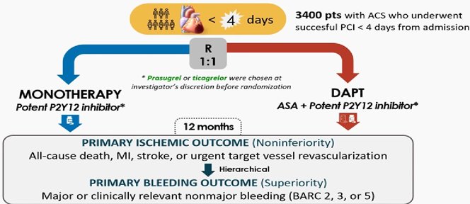 Among patients who had undergone successful PCI for acute coronary syndromes, potent P2Y12 inhibitor monotherapy was not found to be noninferior to dual antiplatelet. Aspirin is still an important drug, at least in these very early phases after infarction and PCI. Guimarães PO, et al. Early Withdrawal of Aspirin after PCI in Acute Coronary Syndromes N Engl J Med.  2025;in press