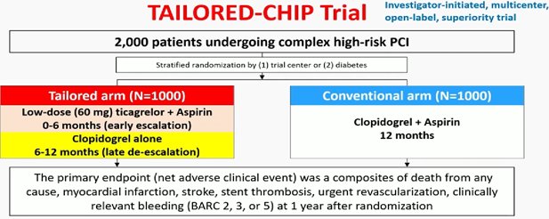 Among high-risk patients undergoing complex PCI, tailored antiplatelet strategy with early escalation and late de-escalation, as compared with dual antiplatelet therapy, did not decrease the incidence of primary net adverse events at 12 months.  Eur heart J 2025
