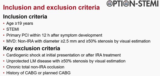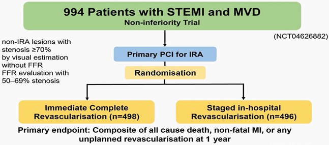 Kim, MC ∙ Ahn, JH ∙ Hyun, DY ∙ et al. Immediate versus staged complete revascularisation during index admission in patients with ST-segment elevation myocardial infarction and multivessel disease (OPTION–STEMI): a multicentre, non-inferiority, open-label, randomised trial. Lancet. 2025;406:1032-1043