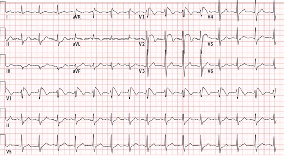 • In dextrocardia with inferior STEMI, the inferior leads show ST elevation per usual. While with anterior STEMI, precordial ST elevation is limited to V1. Reciprocal inferior ST depressions are an important clue to the diagnosis.
