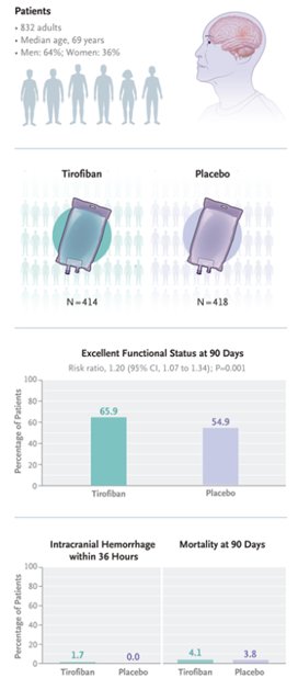 Χορήγηση τιροφιμπάνης(IIb/IIIa inh) πριν την θρομβόλυση(αλτεπλάση 76%) σε <4.5 ώρες σε οξέα ΑΕΕ βελτιώνει την λειτουργική κατάσταση των ασθενών. 24 ωρες μετά τη θρομβόλυση το 65% ξεκίνησε διπλή αντιαιμοπεταλιακή και το υπόλοιπο μονή. ASSET IT trial N Engl J Med 2025;393:1191-1201