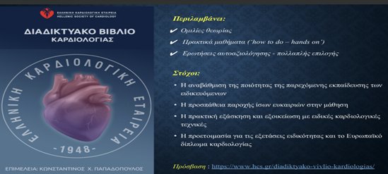 Να συγχαρούμε τις αξιέπαινες προσπάθειες για τη συγγραφή 2 αξιόλογων και χρήσιμων για το νέο καρδιολόγο βιβλίων. 1οδιαδικτυακό βιβλίο καρδιολογίας για τους ειδικευόμενους καρδιολόγους που ήταν η κατάληξη του διετούς εκπαιδευτικού προγράμματος. site της ΕΚΕ, πατάτε εκεί που λέει ‘Εκπαίδευση’ και το βρίσκετε στις επιλογές. Εναλλακτικά: https://www.hcs.gr/diadiktyako-vivlio-kardiologias/