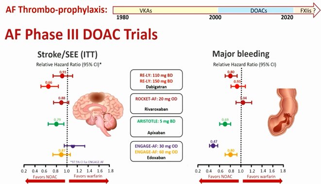 Αυτή είναι η εικόνα που υποστηρίζει ότι τα DOACs δεν είναι κατωτέρα της βαρφαρινης στη πρόληψη εγκεφαλικών από ΚΜ. Η ίδια ομάδα ερευνητών σε μετα ανάλυση έδειξαν ότι τα DOACs υπερέχουν της βαρφαρίνης και στη πρόληψη των συστημικών εμβόλων(10% του συνόλου το θρομβοεμβολικών) και ότι τα συστεμικά έμβολα έχουν κακή πρόγνωση.