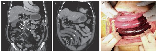 A 68-year-old man with cirrhosis presented to the emergency department with a 2-day history of severe abdominal pain. On PE, hypoactive bowel sounds, pain with palpation, and rebound tenderness throughout the abdomen were noted. CT of the abdomen with administration of contrast material showed thrombosis of the superior mesenteric vein ( A, arrows). A long segment of small bowel in the right lower quadrant of the abdomen showed increased wall thickness and decreased enhancement (B, asterisks). Cirrhosis of the liver and a few esophageal and paraumbilical varices were also seen. Owing to concern for bowel ischemia, an exploratory laparotomy was performed, during which dusky bowel extending from the distal jejunum to the proximal ileum was seen (C). A diagnosis of acute superior mesenteric vein thrombosis complicated by small-bowel infarction was made. Resection of the infarcted bowel, transvenous thrombolysis and thrombectomy, and a primary anastomosis were performed. The patient was discharged home on postoperative day 14 with a prescription for long-term apixaban. An extensive workup for causes of mesenteric vein thrombosis identified only the patient’s known cirrhosis. At a 5-month follow-up visit, he was doing well, and imaging showed resolution of thrombosis; he has continued to receive long-term anticoagulation therapy