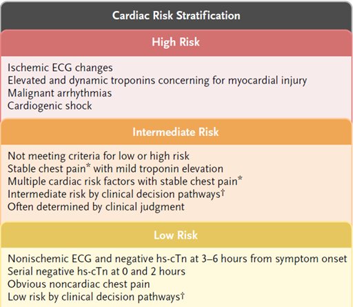 Διαβάθμιση καρδιακού κινδύνου για τη περίπτωση ασθενούς με πόνος το στήθος. Ο ενδιάμεσος κίνδυνος συνήθως κατατάσσεται με κλινική κρίση. Σταθερός πόνος αναφέρεται στα συμπτώματα με δραστηριότητα , άσκηση