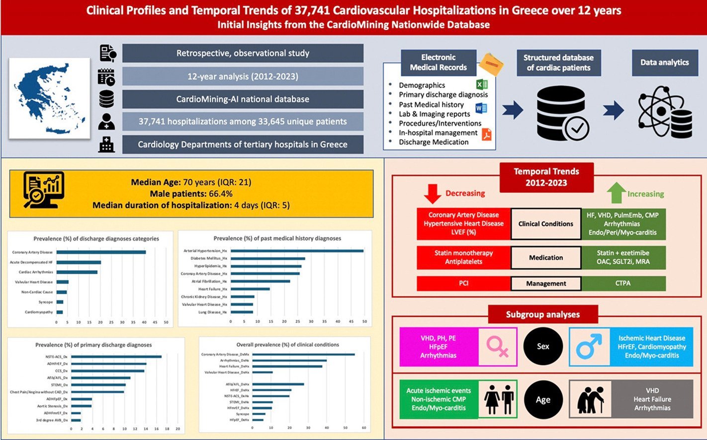 Η CardioMining είναι η πρώτη πανελλαδική, αναδρομική μελέτη 37.741 καρδιαγγειακών νοσηλειών σε διάρκεια 12 ετών (2012 – 2023) στην Ελλάδα, με δεδομένα που ελήφθησαν από τις μεγαλύτερες πανεπιστημιακές κλινικές και τριτοβάθμια νοσοκομεία της χώρας. Τα πρώτα αποτελέσματα της μελέτης, που δημοσιεύθηκαν πρόσφατα στο Hellenic Journal of Cardiology, παρέχουν μια «ακτινογραφία» των καρδιολογικών νοσηλειών στην Ελλάδα.