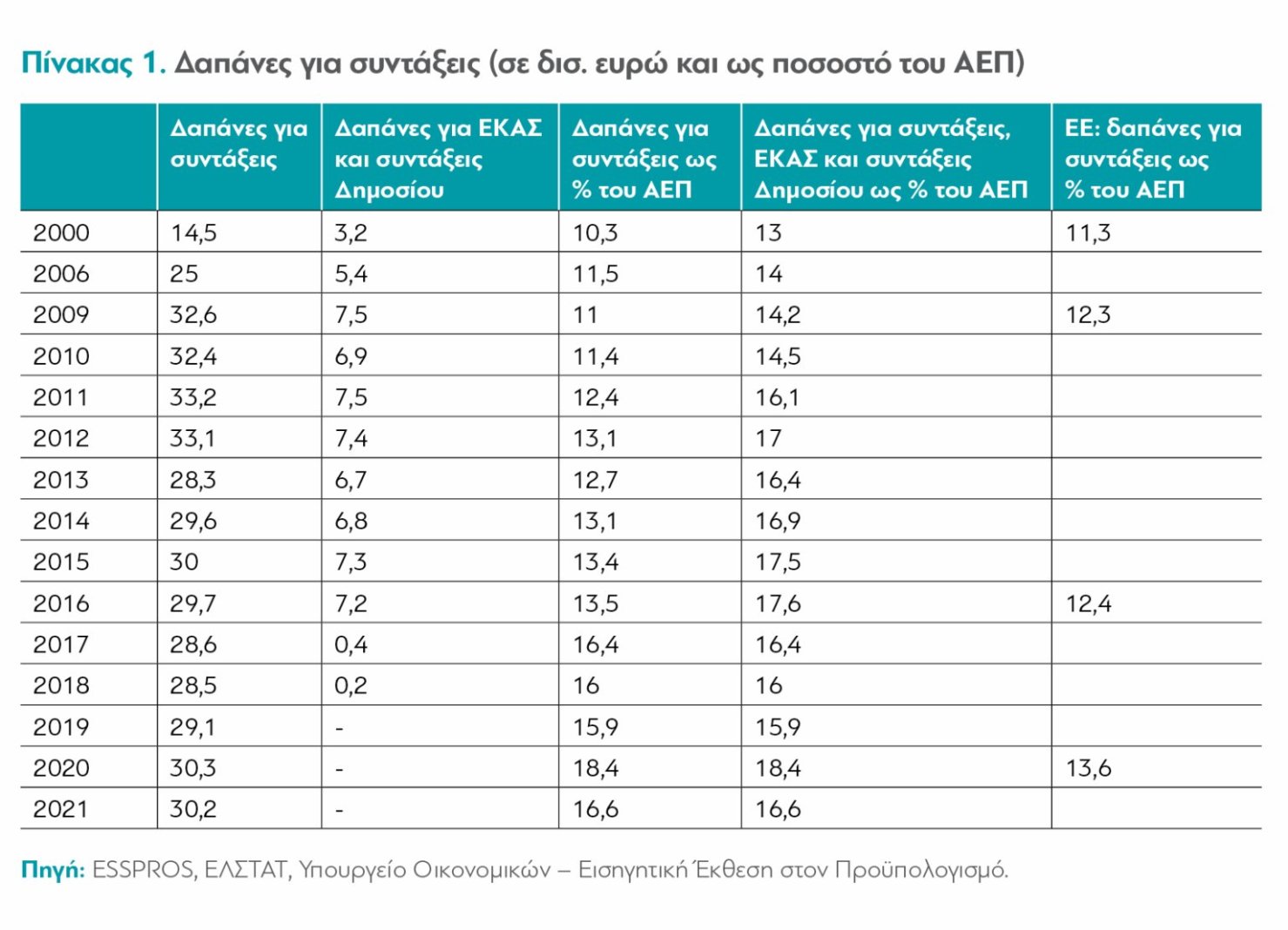 Ως ποσοστό του ΑΕΠ, οι συντάξεις μαζί με το Επίδομα Κοινωνικής Αλληλεγγύης Συνταξιούχων (ΕΚΑΣ) και τις δαπάνες του Δημοσίου για τους δημοσίους υπαλλήλους αυξήθηκαν από 13% το 2000 σε 14,2% το 2009, με κορύφωση το 17,6% το 2016 (βλ. στήλη 5 του Πίνακα 1), για να μειωθούν γύρω στο 16% το 2017-2021. Παρά ταύτα, όχι μόνο ως απόλυτα μεγέθη, αλλά και ως ποσοστό του ΑΕΠ οι συνταξιοδοτικές δαπάνες εξακολουθούν να είναι πολύ μεγαλύτερες απ’ ό,τι στις αρχές του 2000 και φαίνεται τα τελευταία χρόνια να έχουν παγιωθεί στο επίπεδο των 30 δισ. ευρώ. Στον Πίνακα 1 φαίνεται, επίσης, η διαφορά μεταξύ Ελλάδας και ΕΕ-27, για επιλεγμένα έτη, στο μέγεθος της σχέσης συνταξιοδοτική δαπάνη/ΑΕΠ: Το 2006 η διαφορά μεταξύ τους ήταν δύο σχεδόν ποσοστιαίες μονάδες του ΑΕΠ. Μέσα σε μία δεκαετία (2016 σε σχέση με 2006) η διαφορά αυτή αυξήθηκε σε πέντε ποσοστιαίες μονάδες του ΑΕΠ και διατηρήθηκε στο επίπεδο αυτό μέχρι το 2020.4