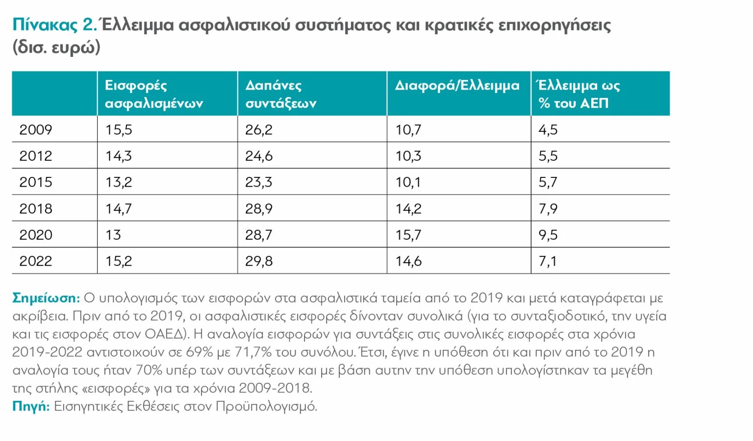 Οι δαπάνες του Ασφαλιστικού δημιουργούσαν σημαντικά ελλείμματα ήδη πριν από την κρίση, τα οποία καλύπτονταν από το Δημόσιο (Πίνακας 2). Οι δαπάνες του Δημοσίου για την κάλυψη των ελλειμμάτων αυτών αυξήθηκαν από 4,5% του ΑΕΠ (2009) σε 5,7% (2015), σε 9,5% (2020), για να μειωθούν στη συνέχεια, καθώς πλέον αυξάνεται και το ΑΕΠ, γύρω στο 7%-7,5% στα χρόνια 2022-2023.
