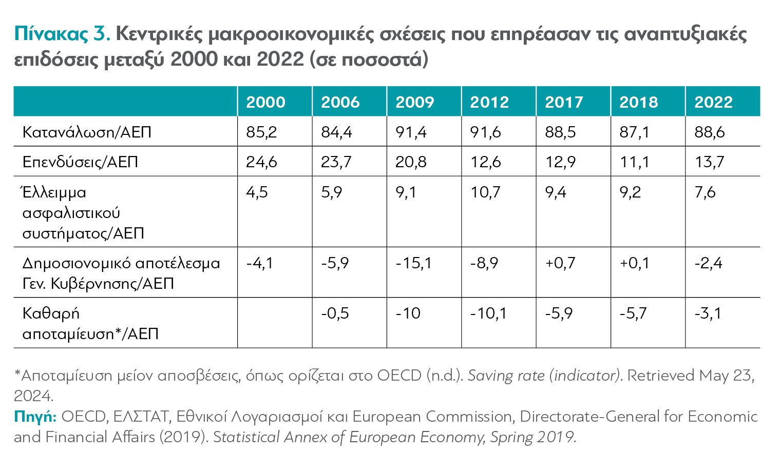 Στον Πίνακα 3 παρουσιάζονται ορισμένες μακροοικονομικές σχέσεις, που είναι άμεσα συνδεδεμένες με τη μεγέθυνση της οικονομίας. Πρακτικά, η αλλαγή από τον εξωτερικό δανεισμό σε εσωτερικές πηγές χρηματοδότησης σήμαινε ότι, αντί τα ελλείμματα του Ασφαλιστικού να οδηγούν στην αύξηση του δημόσιου χρέους, όπως στη δεκαετία του 2000 μέχρι την κρίση, οδηγούν σε μείωση της αποταμίευσης και των επενδύσεων και αύξηση της κατανάλωσης. Η σχέση κατανάλωση/ΑΕΠ, που είχε αυξηθεί ήδη από το 85,2% (2000) στο 91,4% (2009), κινήθηκε μεταξύ 2010 και 2018 κοντά στο 90%, και κυμαίνεται κοντά στο ποσοστό αυτό, δεδομένου ότι, εξ ορισμού, η αύξηση των ελλειμμάτων του ασφαλιστικού κατά 3-4 ποσοστιαίες μονάδες από το 2009  και μετά σημαίνει αντίστοιχη αύξηση της κατανάλωσης. Αντίστοιχα, η σχέση «καθαρή αποταμίευση»/ΑΕΠ από -0,5% το 2006 επιδεινώθηκε έντονα τα επόμενα χρόνια της κρίσης, και διαμορφώνεται στο -3,1% το 2022, ενώ η σχέση επενδύσεις/ ΑΕΠ κινείται στο 13% με 14% περίπου – το χαμηλότερο στην ΕΕ. Οι παραπάνω σχέσεις είναι οι δυσμενέστερες στην ΕΕ και εγείρουν σοβαρά ερωτηματικά για το πώς μπορεί να προχωρήσει η ανάπτυξη της χώρας με τόσο χαμηλά μεγέθη επένδυσης και αποταμίευσης.
