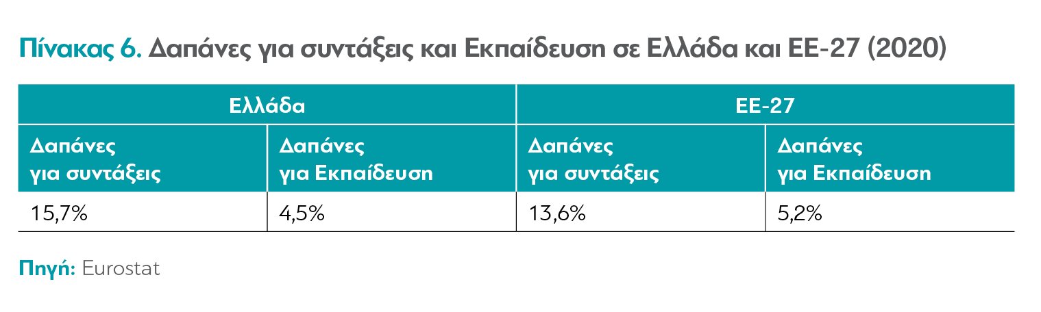 Το Ασφαλιστικό συνδέεται στενά και με τη διαγενεακή δικαιοσύνη, οι προεκτάσεις της οποίας επίσης επηρεάζουν την αναπτυξιακή εξέλιξη της χώρας. Οι επιβαρύνσεις των νεότερων γενεών για τις συντάξεις είναι πλέον όλο και μεγαλύτερες σε σύγκριση με το παρελθόν, σε απόλυτα και σχετικά μεγέθη. Αν συγκριθούν οι δαπάνες για το Ασφαλιστικό, που αφορούν τις μεγάλες ηλικίες, με τις δαπάνες για Εκπαίδευση, που αφορούν τον νέο πληθυσμό και, συνεπώς, τις αναπτυξιακές προοπτικές της χώρας, διαπιστώνεται μια έντονη ασυμμετρία (βλ. Πίνακα 6). Οι δαπάνες για την Εκπαίδευση αντιστοιχούν στο 38,2% των δαπανών για συντάξεις στην ΕΕ-27, αλλά στο 28,7% στην Ελλάδα. Η διαφορά αυτή δεν ευνοεί ούτε το Δημογραφικό ούτε την οικονομική ανάπτυξη ούτε τη διαγενεακή δικαιοσύνη.